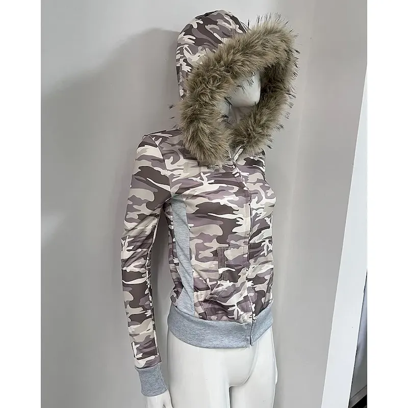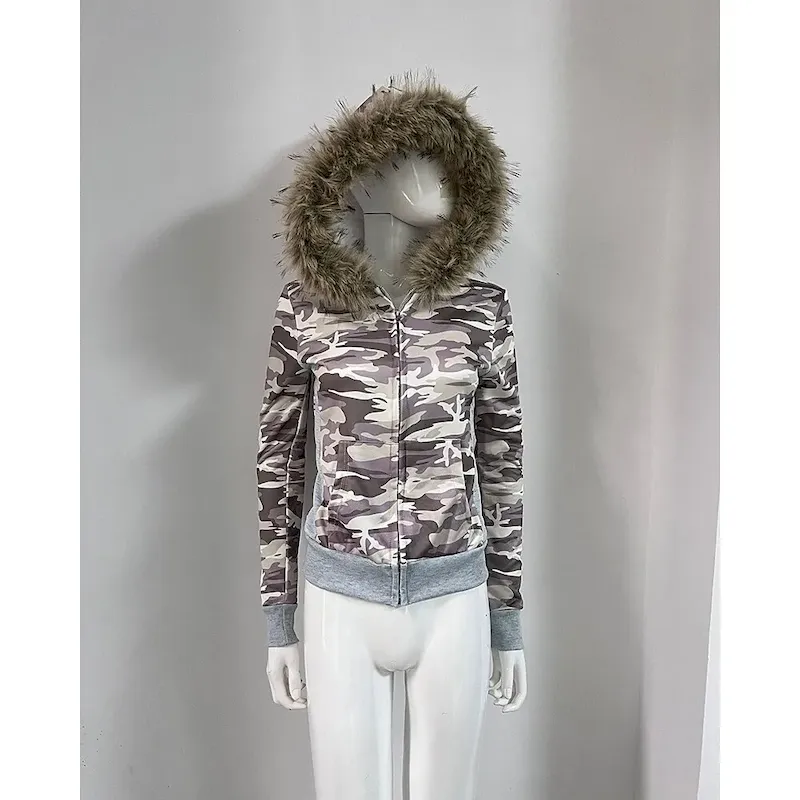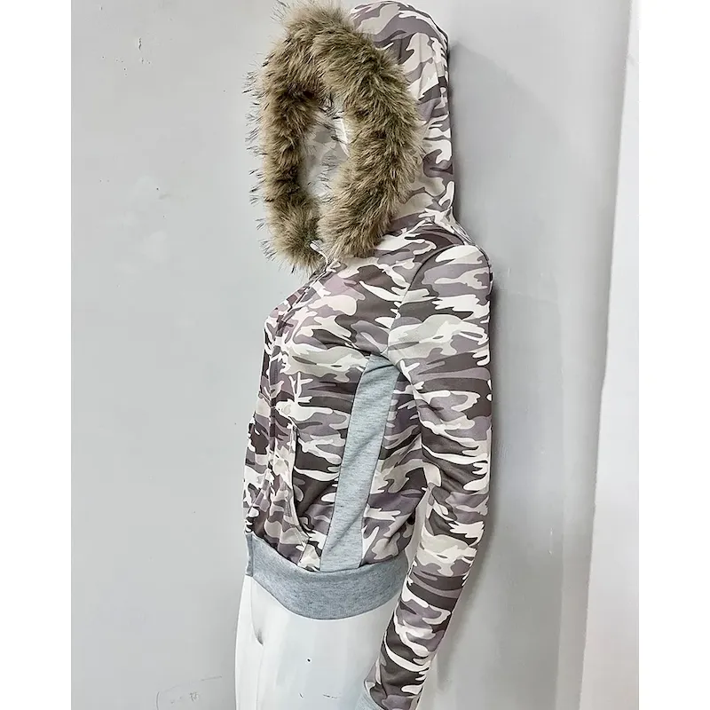 Women’s Fur Hooded Jacket Zip Up Sweatshirt with Pockets Long Sleeve Top Athleisure Fall Camo / Camouflage Lightweight Hiking Vacation Running Sportswear Activewear Gray